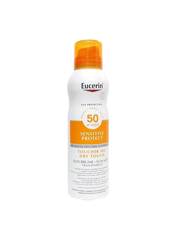 Eucerin SUN PROTECTION SENSITIVE PROTECT Brume Transparent SPF 50 est une Brume solaire pour peaux sensibles, haute protection Formule transparente et légère qui protège efficacement les peaux sensibles et même les peaux à tendance acnéique. Eucerin SUN PROTECTION SENSITIVE PROTECT Brume Transparent SPF 50 est une brume solaire pour le corps transparente, très efficace, développée spécifiquement pour les peaux sensibles. Son système de filtres UVA/UVB photostables à large spectre garantit une protection fiable contre les dommages cutanés causés par le soleil. Il est conforme aux recommandations de l’Union Européenne. Lorsque les rayons UV pénètrent la peau, ils peuvent provoquer des dommages cellulaires jusque dans les couches profondes de l’épiderme. Eucerin Sun Brume Transparente Toucher Sec SPF 50 aide à protéger les cellules cutanées des dommages provoqués par le soleil. La Licochalcone A, un ingrédient actif naturel antioxydant, protège les cellules cutanées des dommages causés par les radicaux libres. Cette formule a été spécialement développée pour le corps. Son conditionnement en aérosol permet une vaporisation rapide et continue dans tous les sens, ce qui simplifie l’application sur les zones difficiles à atteindre. De plus, cette brume transparente à la texture ultra-légère pénètre rapidement et procure un effet rafraîchissant. Eucerin SUN PROTECTION SENSITIVE PROTECT Brume Transparent SPF 50 est résistante à l’eau, non grasse et non collante.