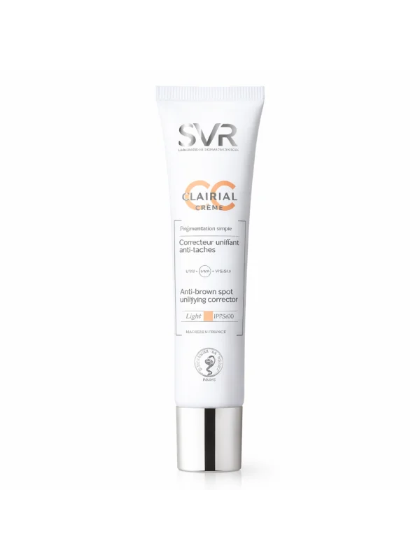 SVR Clairial CC Crème Light corrige les taches, unifie le teint et protège la peau sensible des UV grâce à sa haute protection solaire.