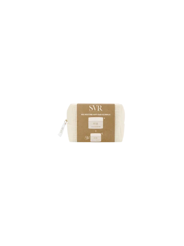 La trousse SVR Densitium, comprenant la Crème Correction Globale 50 ml et le Baume Nuit Réparation Globale 15 ml offert, propose une routine anti-âge complète pour les peaux normales à sèches.